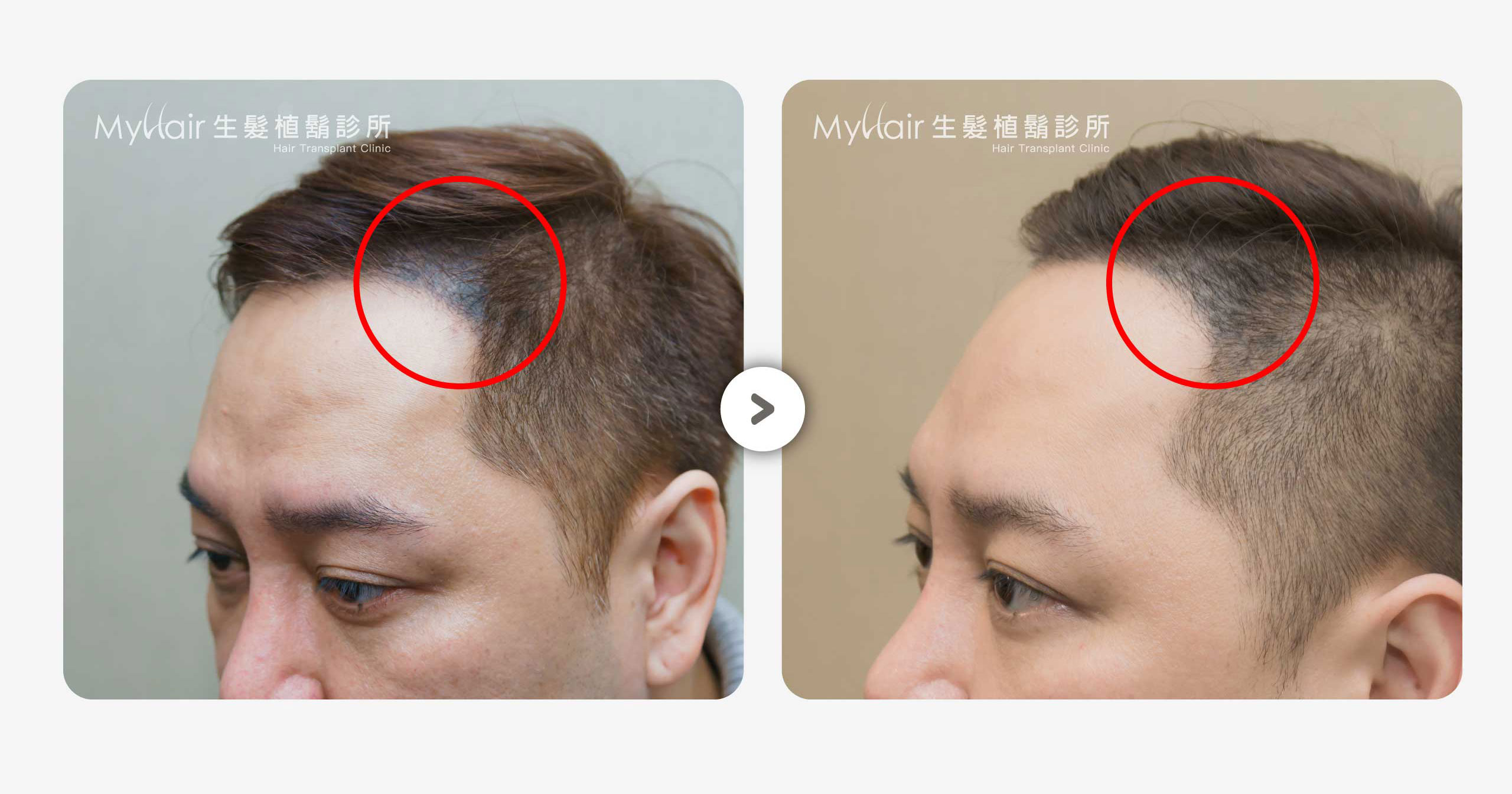 作為一個公眾人物,他比任何人都在意自己的外貌,髮際線兩側的三角部位密度太過稀疏,讓他在造型上十分困擾,因此希望藉由 MyHair 的巧手,讓他能充滿自信的重回舞台。雖然過去也曾經以紋繡的方式來掩飾兩側稀疏的三角區域,但是近距離會被看出痕跡,而且隨著造型染髮時,更會有顏色的落差,畢竟不是解決之道。